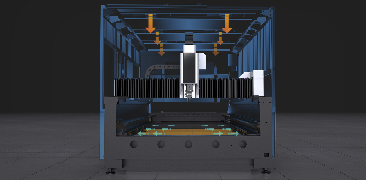 Được trang bị quạt gió Downforce kín, hệ thống này có khả năng thu gom bụi và khói hiệu quả, tối ưu hóa môi trường khu vực cắt.
